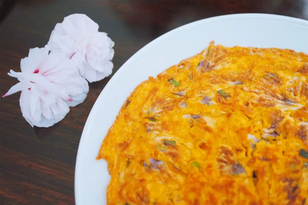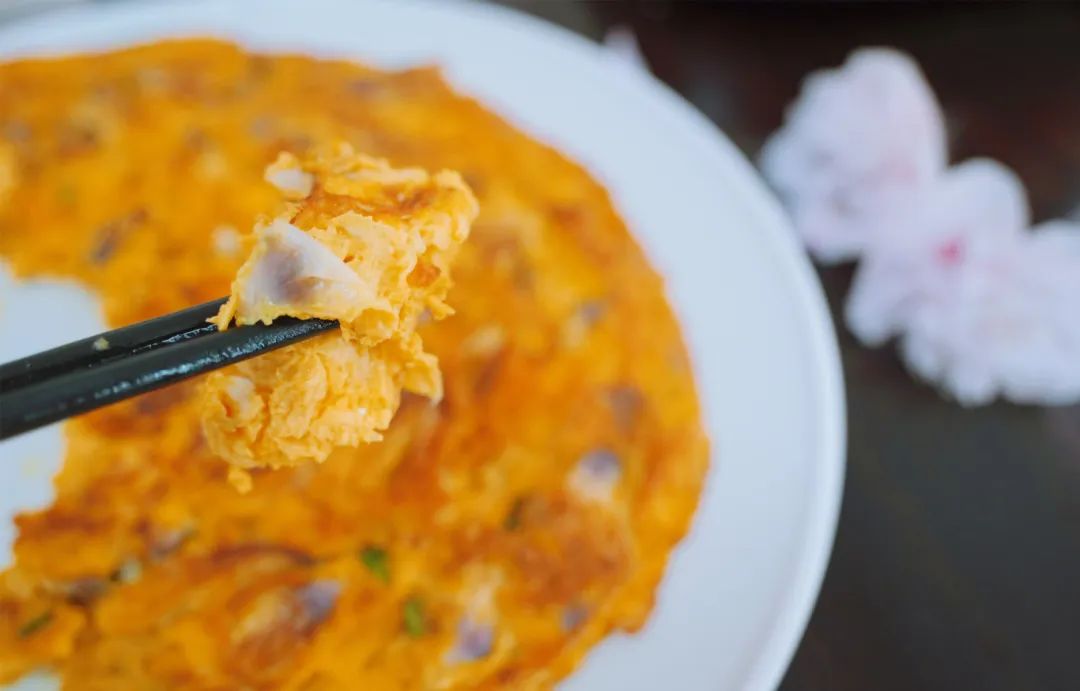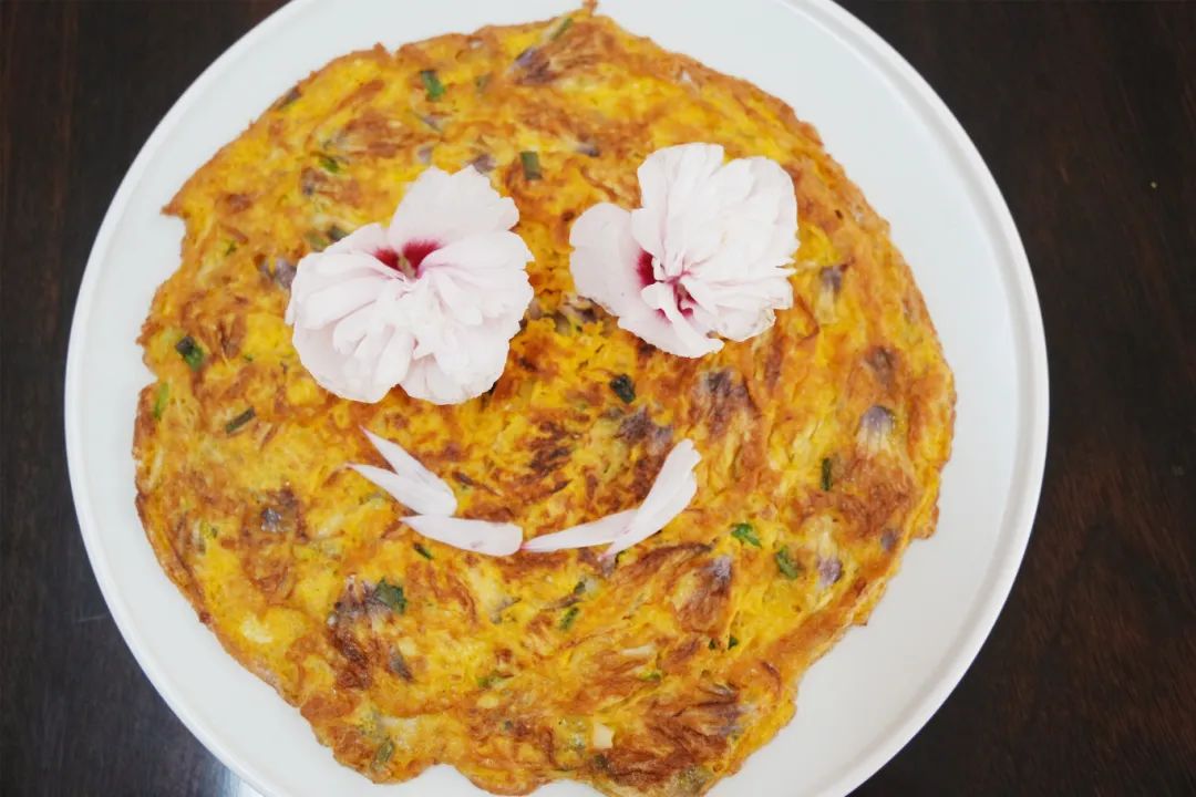 过了一会儿,一盆简单可口的芙蓉煎蛋就完成了,不仅有鲜花的美味,还有鸡蛋的香味,很开胃。
