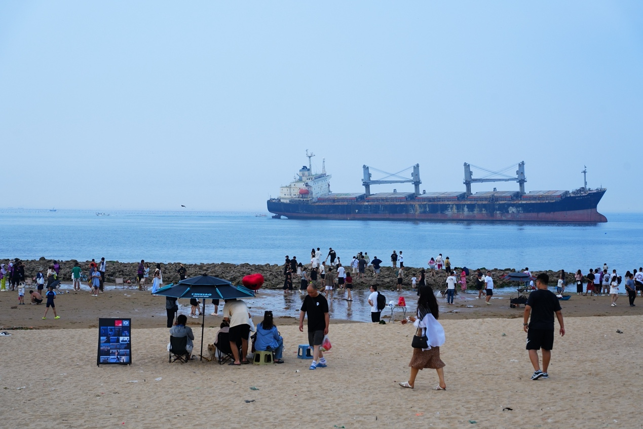 8月初,“记录中国”团队前往“布鲁威斯”沉船景区实地考察。虽然是阴天,但还是有不少游客来沙滩拍照,大部分都是年轻人和亲子家庭。“布鲁威斯”沉船在网上的流行吸引了更多的人。徐州的胡女士特意来这里打卡,是通过社交平台推荐的。