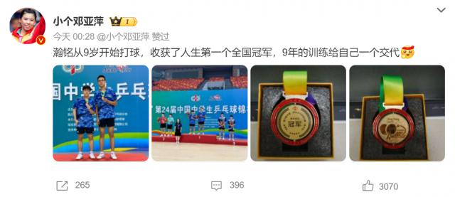 邓亚萍写道:“瀚铭从 9 年纪大了,赢得了人生第一个全国冠军,99岁, 年度训练给了自己一个解释。“照片中,邓亚萍的孩子拿着奖牌,和队友合影。从照片中可以看出,邓亚萍的孩子们参加了双鱼杯。 · 第 24 届中国中学生乒乓球锦标赛。