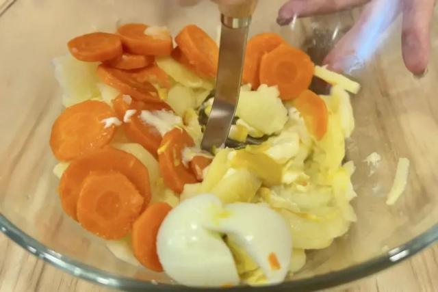 2. 将蒸好的土豆、胡萝卜和鸡蛋放入容器中,加入少许盐、色拉酱、黄芥末酱,压成泥;
