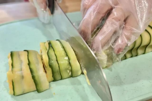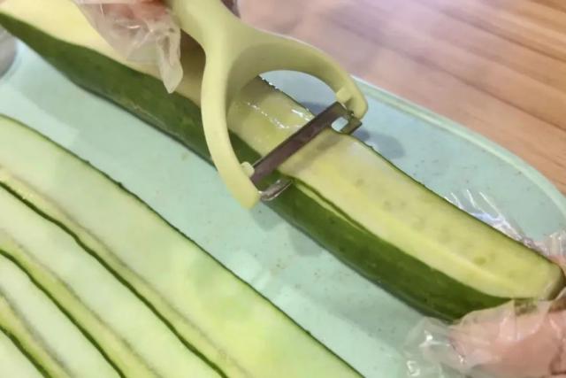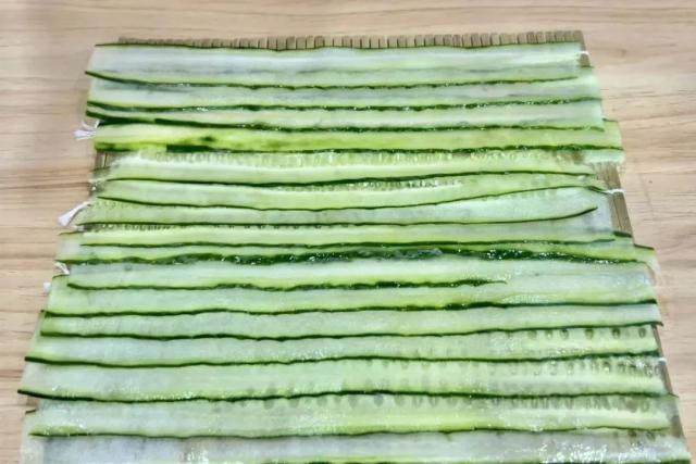 3. 黄瓜洗净,刨成片状,如图叠放在卷帘上,用厨房纸吸收多余的水分;