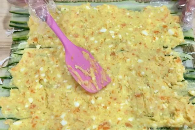 4. 将土豆泥铺在黄瓜卷上;