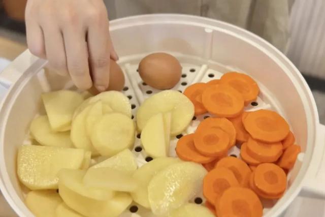 1. 土豆,胡萝卜,去皮切片,放入蒸锅和鸡蛋一起蒸。 20 几分钟后取出;