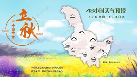 17日晚至18日白天:伊春南部、齐齐哈尔南部、大庆、绥化、哈尔滨、佳木斯、双鸭山东部、鸡西部、牡丹江阴天有阵雨或雷暴,其他地区阴天。