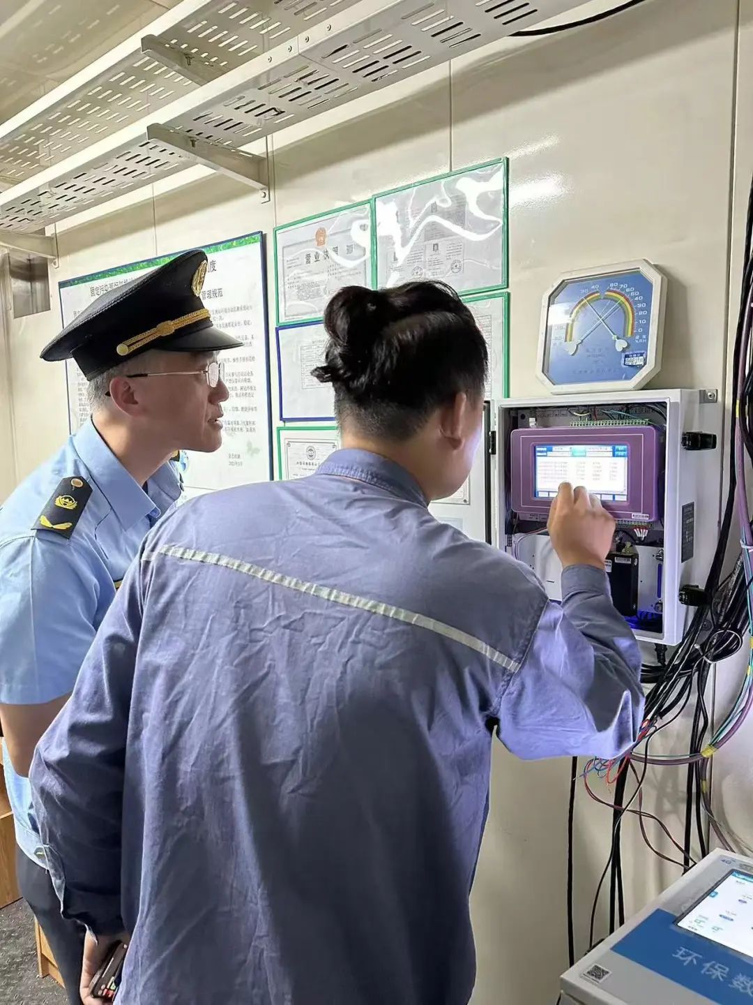 图片显示,宝山区生态环境局执法大队队长叶林正在查看公司的在线数据。