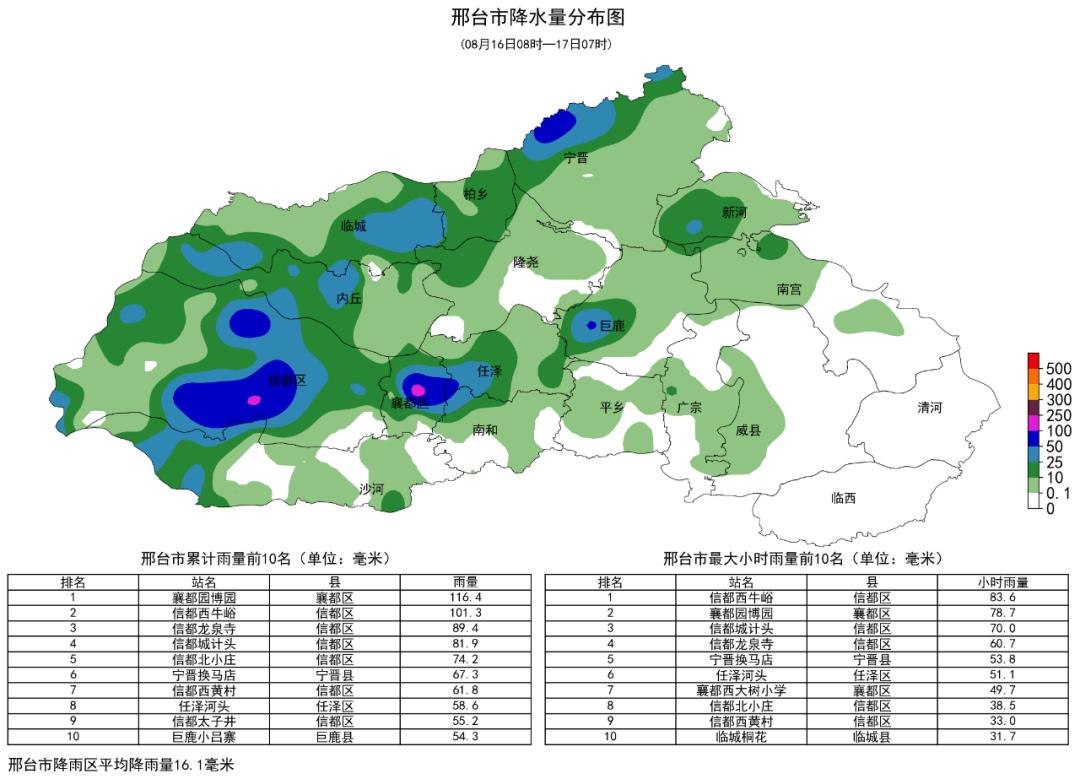 【8月16日8时~17日7时】邢台市发生渗透性雷暴或阵雨。西部地区和北部地区的局部暴雨到暴雨,部分地区的暴雨和降水区的平均降水量为16.1。mm,除威县、清河、南和、平乡、临西外,信都、襄都、巨鹿、宁晋、沙河、临城、新河、任泽、内丘等县(市、区)降水超过10毫米,降水超过25毫米。信都、襄都、宁晋、任泽、巨鹿出现超过50毫米的11站,城市园区116.4mm、信都西牛峪101.3mm,西牛峪83.6,最大小时雨量信mm(16日16:00—17:00)。现在邢台市降雨强度较弱,预计17日白天邢台市有渗透性雷雨或阵雨,西部地区局地中至大雨,个别地区大雨。目前邢台市降雨强度较弱。预计17日白天邢台市将出现渗透性雷暴或阵雨,西部地区局部地区将下大雨,部分地区将下大雨。平均降水量5~10mm,西部地区30mm~60mm。