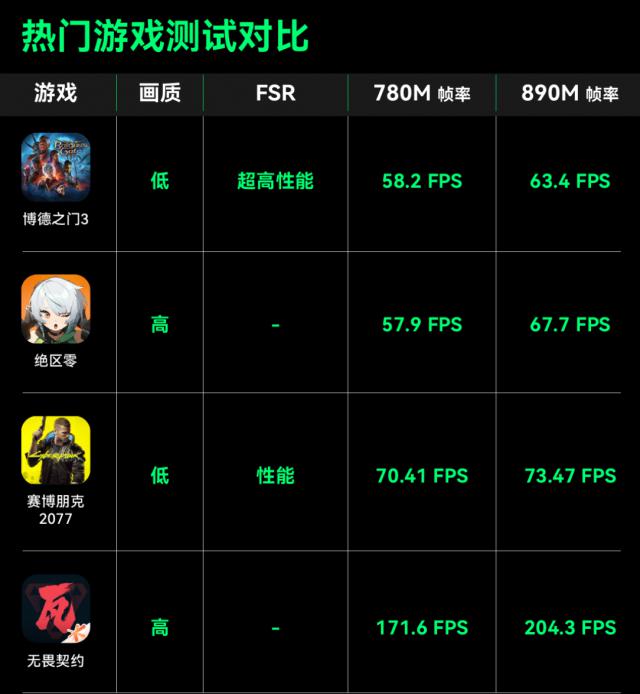 其它热门游戏也可以在 1080P 下游畅玩,托尼用 780M 对比为大家做了一份表格。