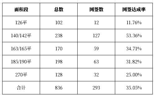 本人独立统计了每个面积的网签总数、网签数量,见下表: