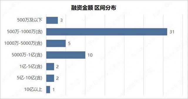 本周已经披露了金额的融资事件。 54 从上周开始,增加了 6 起。本周,融资金额区间分布结构与上周大幅移位, 500 融资事件发生在万以下 3 从上周开始,持平;500 万 -1000 万(含 1000 万)融资事件总数 31 从上周开始,比上周有所增强 15 起;1000 万 -5000 万(含 5000 万)融资事件为 5 起,较上周降低 2 起;5000 万 -1 亿(含 1 十亿美元)融资事件 10 从上周开始,比上周减少了 2 起;1-5 亿(含 5 亿)融资事件为 2 从上周开始,比上周减少了 3 起;这周 5-10 亿(含 10 十亿美元)融资事件 2 从上周开始,和上周一样;本周 10 超过1亿的融资事件是 1 起步,低于上周 1 起。