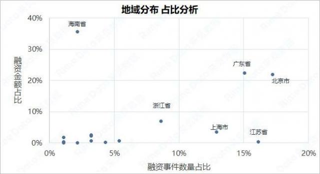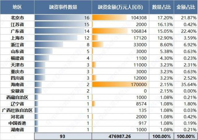 本周地理分布方面,北京市、江苏省、广东省、上海市、浙江省是融资事件数量前五的地区,前五地区总融资事件发生。 65 起初,占所有融资事件总数的总和。 与上周相比,69.89%的区域集中度下降。 4 %。融资金额方面,本周前五地区为海南省、广东省、北京市、浙江省、上海市,前五地区融资金额总额。 43.13 占全部融资总额的亿元 与上周相比,90.41%的区域集中度略有下降。由于港能投资集团大规模融资的影响,海南省融资金额居首。