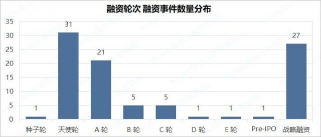 从融资轮的分布来看,本周天使轮是最活跃的,融资事件数量达到 31 从上周开始,比上周有所增强 10 起步,占比达到 33.33%;战略性融资排名第二,达到第二, 27 起,比例为 29.03%;A 轮子排在第三位,为 21 从上周开始,比上周有所增强 2 起,占比 22.58%。就融资金额而言,本周天使轮受巨大影响的比例最高,达到 47.40%,其次是 A 轮融资,融资金额占比 28.86%。战略性融资排名第三,融资比例为 14.30%。总体而言,本周融资轮次分布较上周大幅移位。