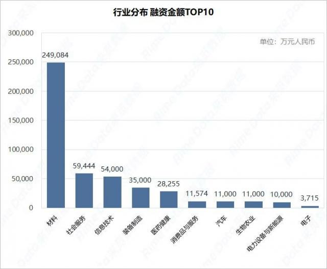 根据融资金额统计,前五个行业依次是材料、社会服务、信息技术、设备制造和医疗卫生,前五个行业的融资金额总额 42.58 亿元,占融资总额 在融资金额上,89.26%的行业集中度较上周有所下降。 7%。就融资金额而言,本周的材料居首,主要是由于港能投资集团和万力轮胎等大规模融资事件的影响。由于纷享销客大额融资事件的影响,社会业务领域排名第二。另外,信息技术1亿元以上的大额融资事件最多,为 4 从头开始,所以排名第三。