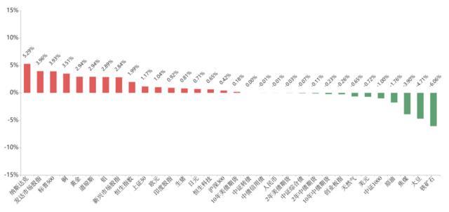 就资产类别而言,上周海外权益普遍反弹,纳斯达克重返 17000 价格方面,德国、法国、日本、韩国、澳大利亚、沙特阿拉伯等全球重要市场指数都喜出望外;在商品方面,受流动性波动较大的影响,铜、油、铝、天然气等类型全线上涨。只有铁矿石和焦煤继续承压,全年跌幅超过 在通胀预期下降后,20%的生猪和大豆品种价格波动明显下降,黄金期货价格保持高位波动,白银期货价格上涨超过 2%。上个星期,美元指数承受了轻微的压力,仍然保持在百元“价格”之上。
