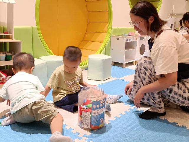 原来这位家长预约报名是因为平日工作忙,没时间照顾宝宝。他偶然得知街道社区的婴儿房提供婴儿护理服务。孩子们一进入“婴儿房”,就立刻被各种各样的玩具、游戏和运动所吸引。他们很快融入了这个陌生的环境,玩得很开心。