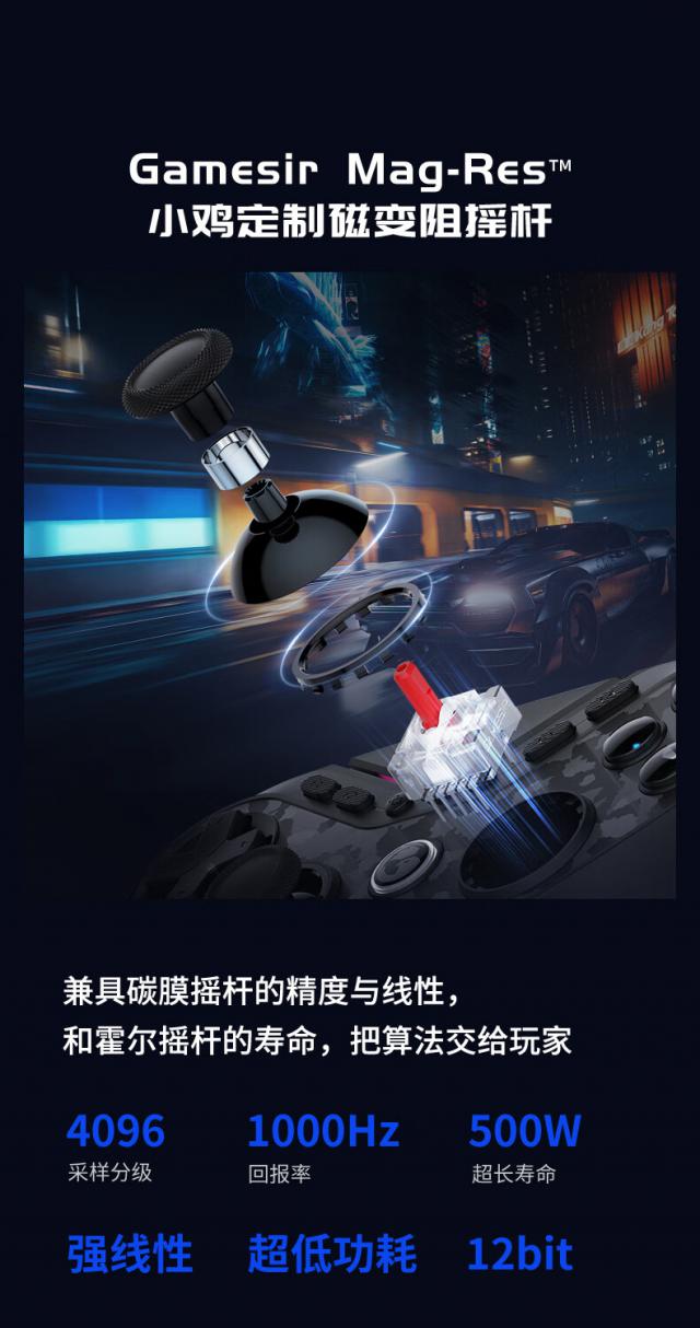 该摇杆搭载小鸡 GameSir Mag-Res 定制磁变阻遥杆,支持 4096 等级取样分级,回报率 1000Hz。官员说,这个遥杆具有强线性。 高取样 高回报率 长寿命 低功耗五大特点。