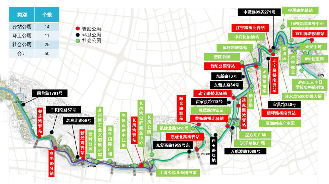 普陀区绿化市容局对苏河沿线公厕的现状进行了深入调查,对环卫、绿地公园、苏河驿栈、社会单位公厕的不同情况进行了全面了解,探索了除环卫公厕外的其他三类公厕的对外开放和规范管理。截至目前,普陀区已有50个半马苏河沿线公厕21公里,大大提高了市民上厕所的便利性。