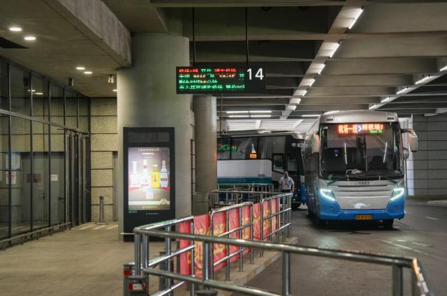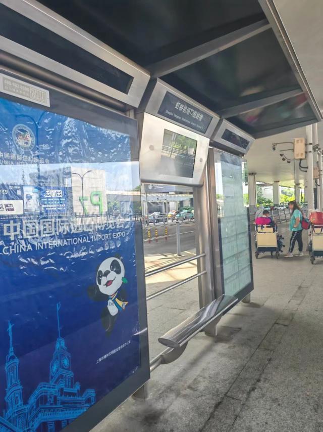 到达虹桥二号航站楼后,从南彩虹桥出来,正对面可以看到“公交车”标志。