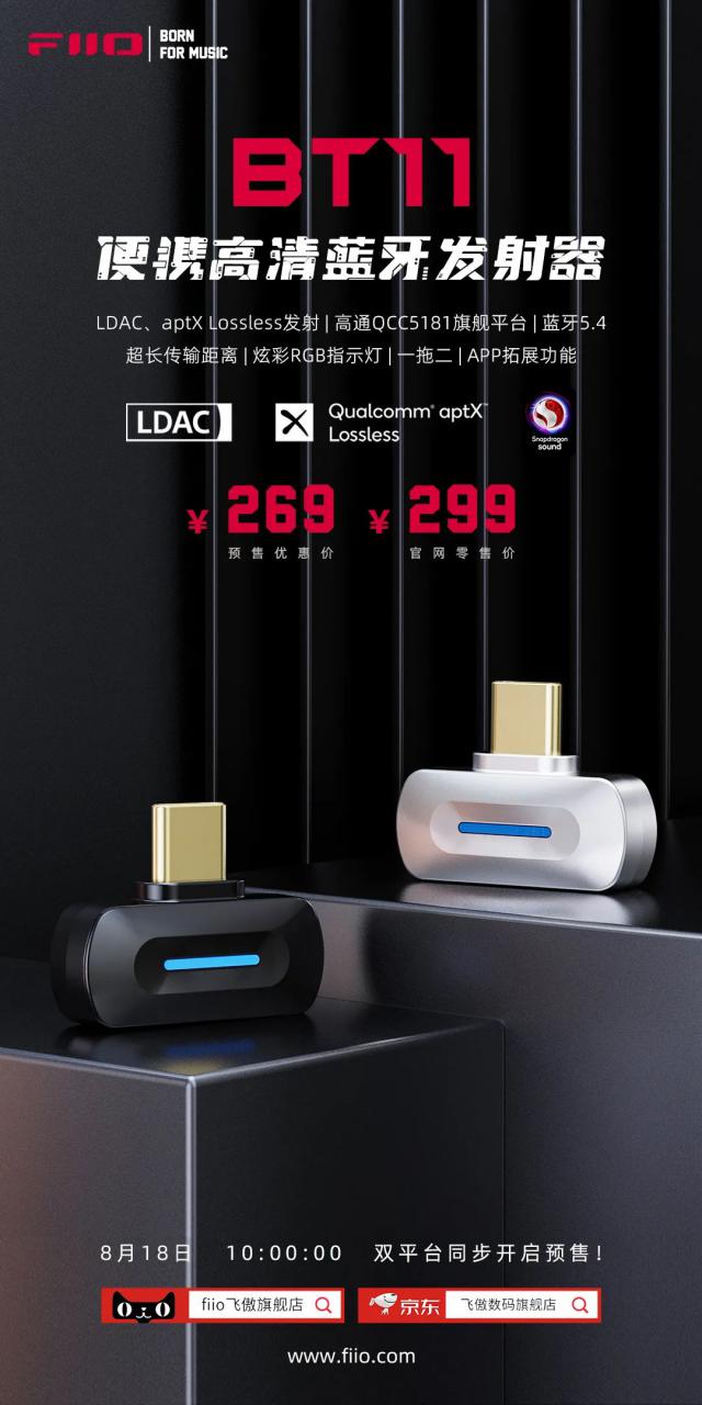IT 世家 8 月 18 日消息,飞傲 BT11 今天便携式超清蓝牙发射器 10:00 打开预售,发射器支持 LDAC,零售价 299 元,首发 269 元。
