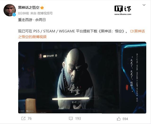 IT 世家 8 月 18 日消息,IT 从官方获悉,“黑神话:悟空”现在已经可以了 PS5 / STEAM / WEGAME 提前下载平台,游戏将在 8 月 20 日早上 10 点解锁。