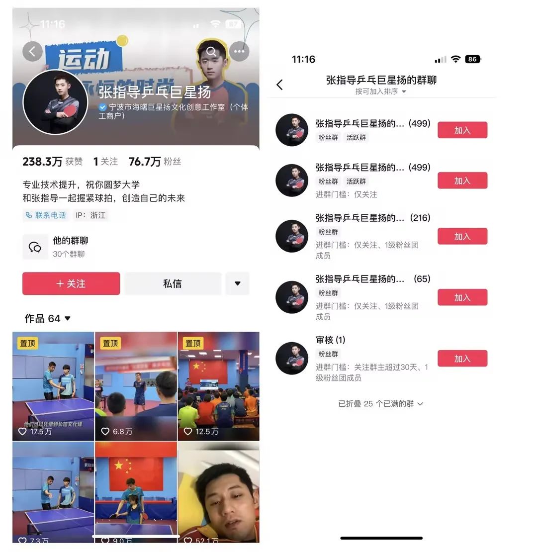 隔天,近 300 一万人涌入其抖音账号“张指导乒乓巨星扬”的直播间。 8 月 15 每天,这个账号的粉丝数量增加到 75.3 万,获得 232.5 万点赞,30 个粉丝团中 25 已满员。