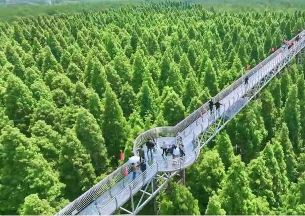 李中水上森林公园以其独特的堆垛地貌和茂密的水上森林而闻名。这里的水杉高耸入云,树干笔直挺拔,形成绿色屏障。漫步在浮桥上,四周是波光粼粼的水面和郁郁葱葱的树木,仿佛置身于一个巨大的绿色谜宫中,清凉的感觉油然而生。