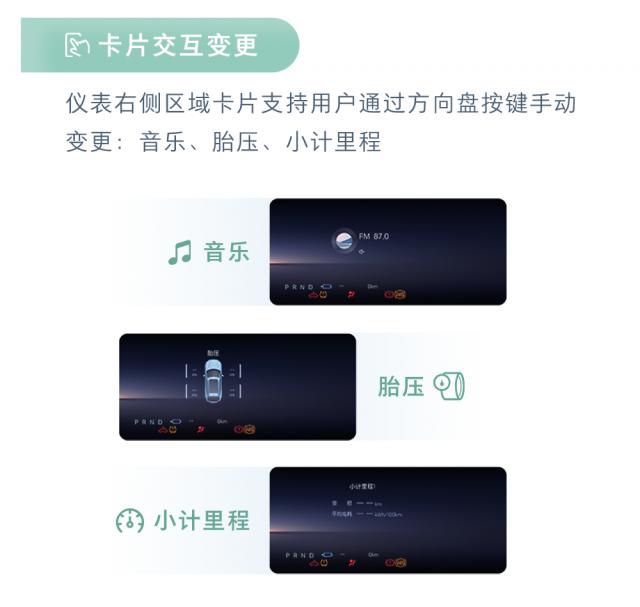 仪表右侧区域卡支持用户通过方向盘按钮手动更改:音乐、胎压、小计里程