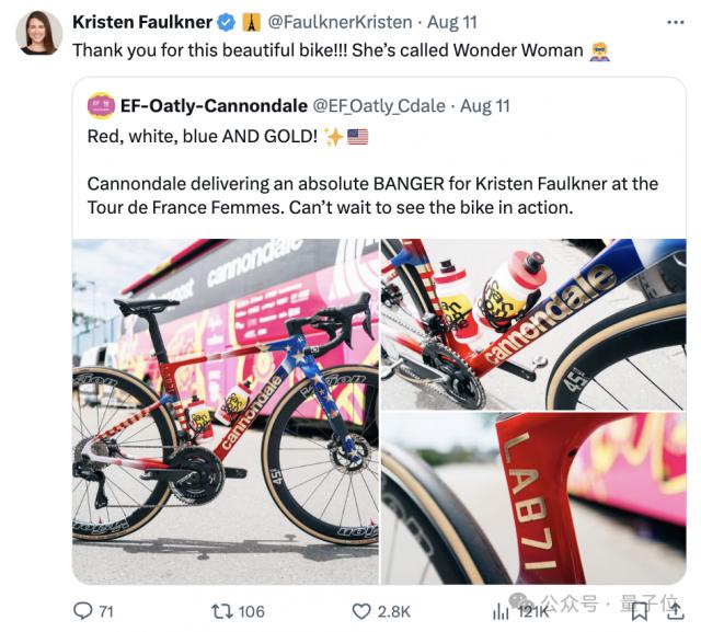 现在福克纳的车队在哪里?—— EF Education-Tibco-SVB,为她准备了一辆特别设计的公路自行车,福克纳将其命名为“神奇女侠”(Wonder Woman)"。