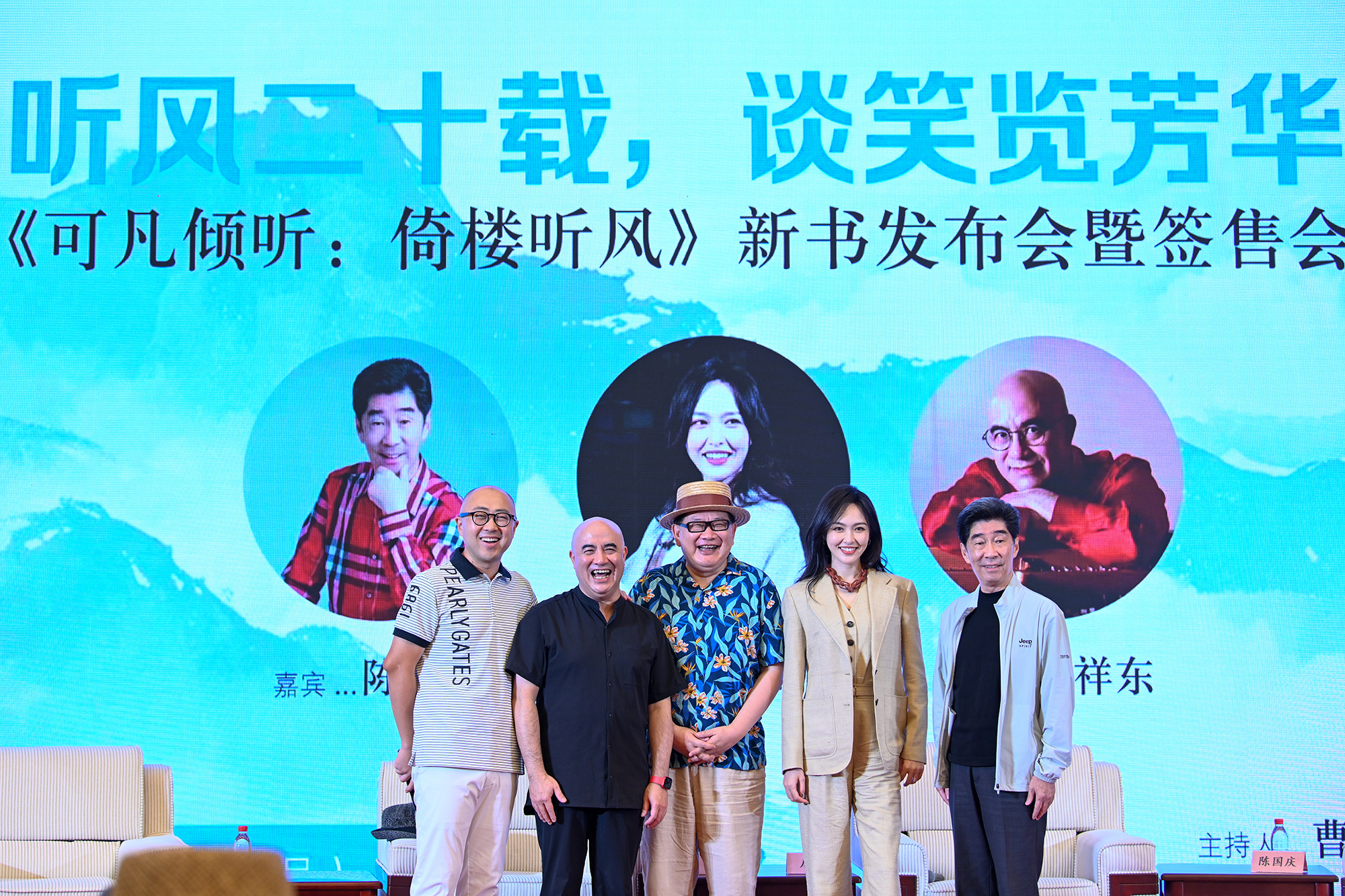 2024年8月17日,在上海博览中心,曹可凡(中)的《可凡倾听:倚楼听风》发布会嘉宾有孔祥东(左二)、唐嫣(右二)、陈国庆(右一)。本报记者 朱伟辉 图