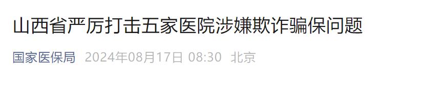 8月17日,据“国家医保局”微信微信官方账号消息,2024年6月至7月,国家医保局会同山西省医保局,利用大数据模型筛选山西省部分城市医保基金使用数据。根据异常线索,对忻州市保德县德信医院、代县和平医院、朔州市应县东城医院、济民医院、夕阳红华康医院进行了专项整治,初步发现涉嫌欺诈和保险欺诈。