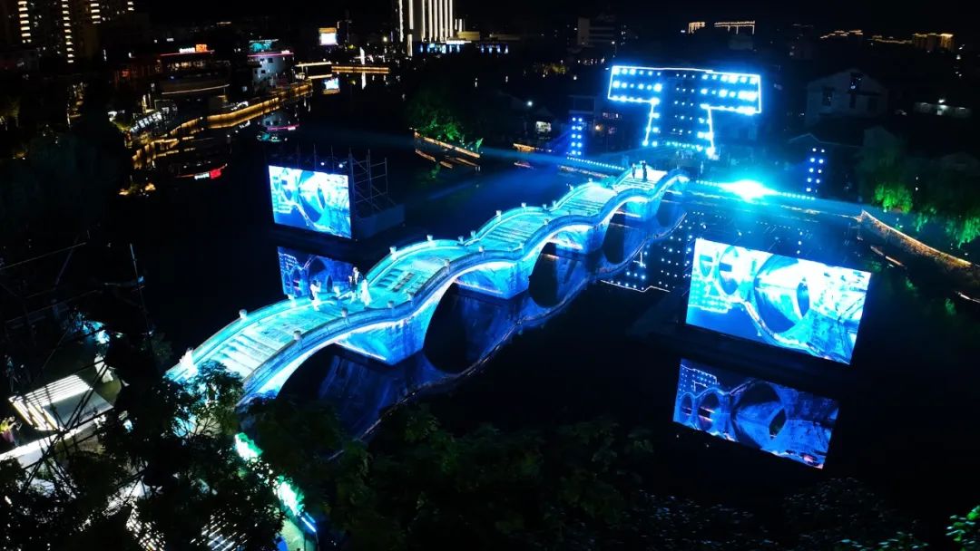 位于西城街道的五洞桥亲水圈。五洞桥原为西浦渡,位于黄岩城西部,横跨西江,东接西街,西连桥上街,为黄岩县通往西乡之要津,1982年为黄岩县文物古迹,1989年列为省文物古迹,现为第六批全国重点文物保护单位,随着城市建设的加快,五洞桥进行了翻新,恢复了五洞桥的“五洞”面貌。五洞桥亲水圈内推突出古朴与现代美的融合,别具一格。夜景灯光,暮色四合,华灯初上,绚丽多彩,美轮美奂。