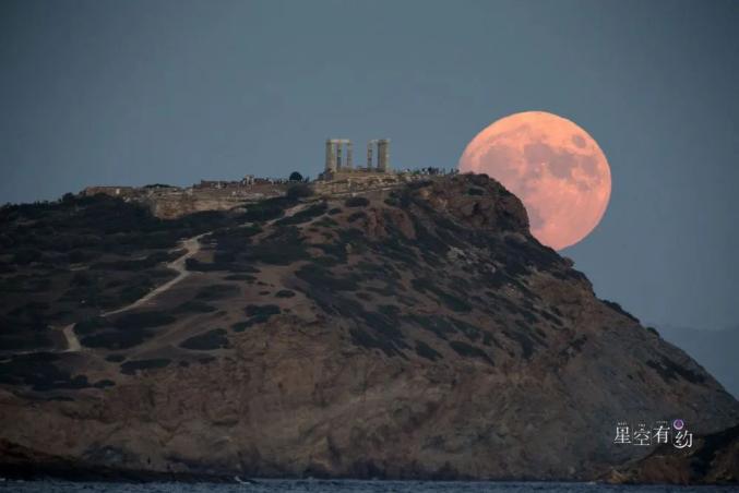 “非常月亮”于2023年8月30日从波塞冬庙上空升起,希腊苏尼翁角。新华社(马里奥斯·罗洛斯摄)