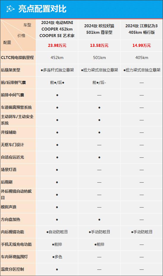 这次我们选择了和 2024 款电动 MINI COOPER(以下简称电动 MINI COOPER)同样是纯电动小型车,设计比较个性化 2024 欧拉好猫(以下简称欧拉好猫)和 2024 款江淮钇为 3(以下简称江淮? 三是进行比较。就售价区间而言,尽管电动 MINI COOPER 已引进国产产品,但售价区间仍是三款车型中最贵的,与另外两款车型相差甚远。考虑到三款车型品牌力的差异,这种情况也是正常的。但是就车型数量而言,电动汽车 MINI COOPER 和欧拉好猫都是 5 款式,江淮为 3 为 8 款式,显然后者的选择更丰富。