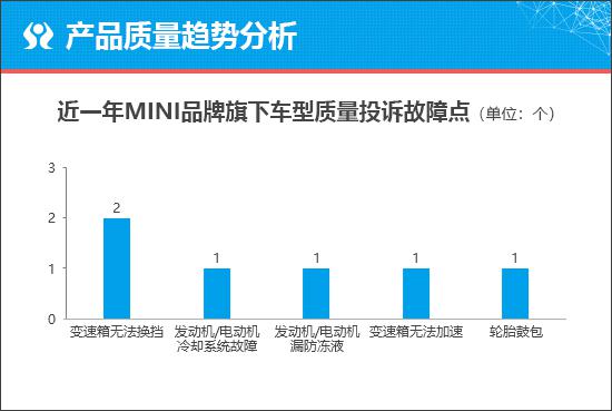 通过筛选 MINI 近一年来,品牌旗下车型的投诉数据显示,故障问题较为分散,数量仅为个位,不存在共性问题。进一步分析了解到,电动 MINI COOPER 由国内工厂本土化生产,不同于以往的进口方式,新车采用纯电动设备,可以暂时认为不会出现上述问题的概率很大。但是实际情况如何,还要等它上市使用一段时间才能得出结论。
