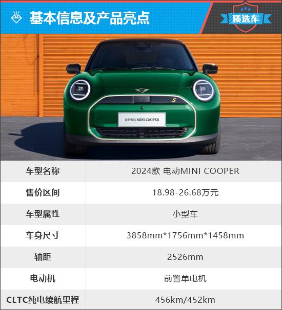 2024 款电动 MINI COOPER 于 2024 年 7 月 6 日本正式上市。新车共推出 5 车辆,全部配备外置单电机,续航里程根据配备版本的不同分为 456km 和 452km。