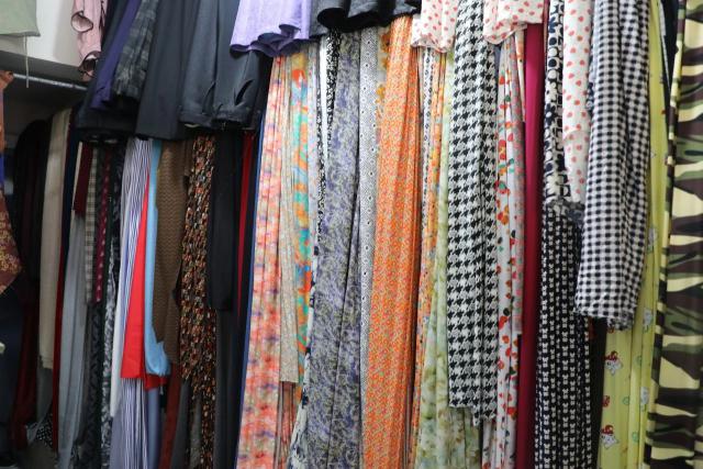 有了工具,你必须有面料。店里有不同材质的面料,有棉花、雪纺、亚麻,适合春夏穿着,还有秋冬的羊绒和羊毛。五颜六色的面料整齐地挂在墙上,使得小店不低,反而像一个风格独特的展览。