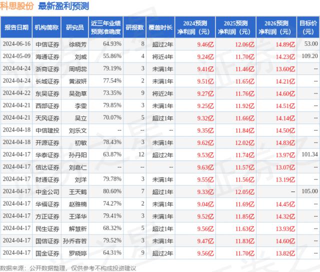 根据近三年发布的研究报告数据,中金公司王天鹤研究员团队对此进行了深入研究,近三年平均预测准确度高达 预测80.6% 2024 年度归属净利润为利润 9.33 十亿,根据现价转换预测。 PE 为 5.52。
