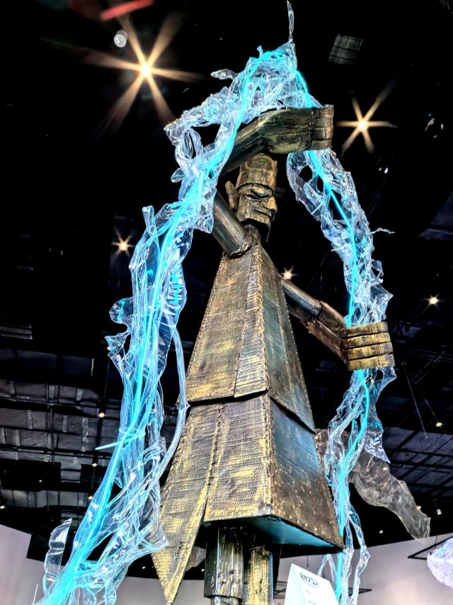 张相国介绍说,“治水大立人”手里拿着一条带有荧光和蓝光的环形水带。这个想法源于团队周依择孩子参观上海博物馆三星堆展览后的灵感——她认为青铜大立人手里拿着水。”我们团队采用了这个奇妙的想法,选择了透明的塑料材料来呈现水流的清澈质感。”张相国解释说。