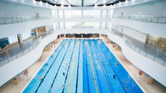 一走进上海游泳池,一个显眼的大屏幕显示了场馆每个游泳池的水质实时动态,包括室温、水温、pH 数据如值、余氯、浊度等,一目了然。