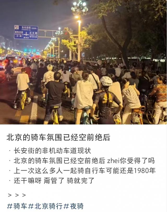 其实真正的北京骑行圈是留给新中产阶级的,不仅要卷装备,还要卷速度和路线。周末可以刷妙峰山和戒台寺。只有游客和入门级爱好者才会聚集在长安街,骑自行车共享看夜景。