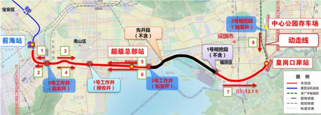 全线地下敷设,设有超级总部站、皇岗口岸站 2 中心公园的地下站和存车场 1 位置,线路设计速度 160km/h。