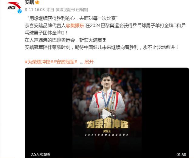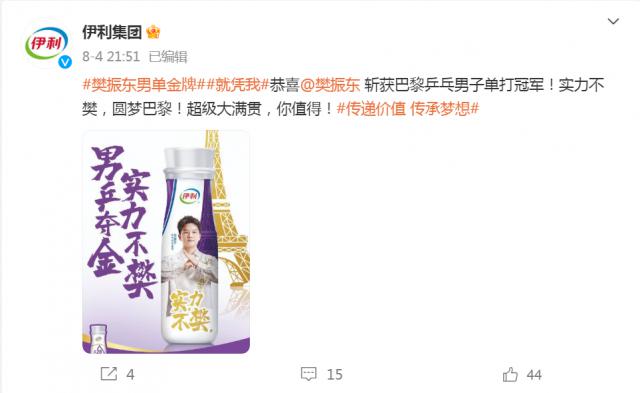 伊利、安踏等官方微博在樊振东夺冠后迅速发文祝贺樊振东。