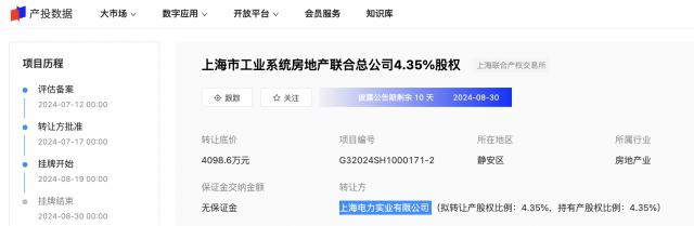 乐居财经 刘治颖 8 月 19 上海市工业系统房地产联合总公司日 4.35% 股份挂牌转让,转让底价为 4098.6 万元,转让方为上海电力工业有限公司,挂牌结束日期为 2024-08-30 00:00。