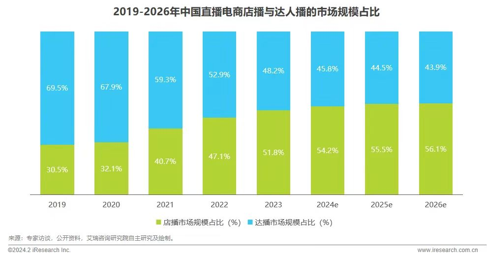 让我们看看整个市场,根据《2023中国直播电商行业分析报告》,2023年行业总销售额达到4.9万亿元。其中,店铺播出占51.8%,比达人直播销售占3.6%。