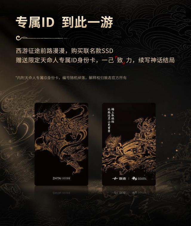 联名新产品的外包装以黑色为主,整体采用中国传统的重墨技术,用刷子勾勒出两条线条,辅以水墨画笔描绘的云海底纹。此外,硬盘本身写有联名相关词语,有限”命运人专属身份卡"。