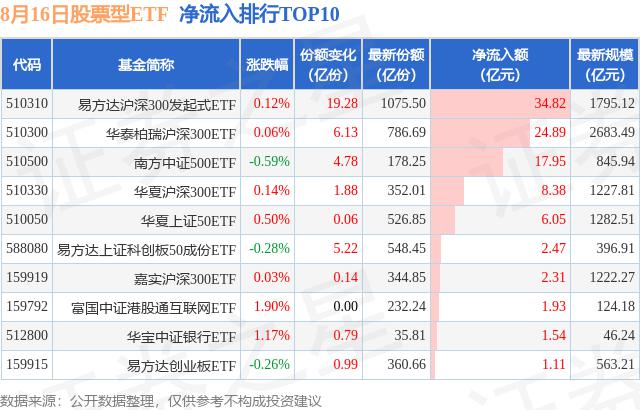 当天有 365 只股票型 ETF 资金净流入出现在基金中,其中E基金净流入排名第一。 300 发起式 ETF(510310),份额增加 19.28 十亿份,净流入额为 34.82 亿元。净流入排名 TOP10 如下: