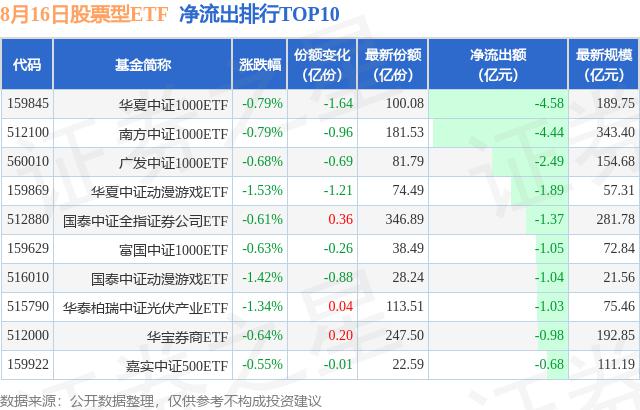 当天有 461 只股票型 ETF 资金净流出,其中华夏中证在净流出中排名第一。 1000ETF(159845)减少了份额 1.64 一亿份,净流出额为 4.58 十亿美元。净流出排名 TOP10 如下: