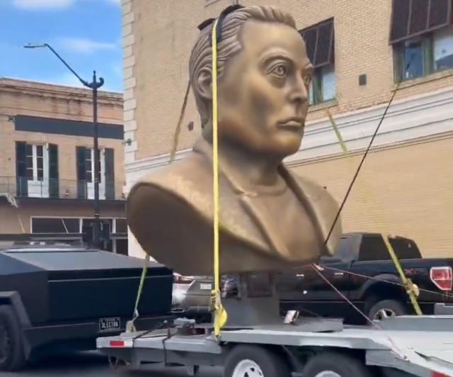 由特斯拉拉出现的马斯克雕像 Cybertruck 托运