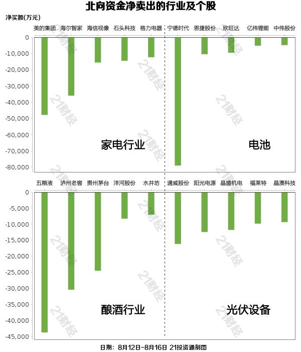 北向资金减持 74 其中,家电行业数量最多,净销售额达到 15.05 亿元,其次是电池行业,净卖出。 13.66 亿元。