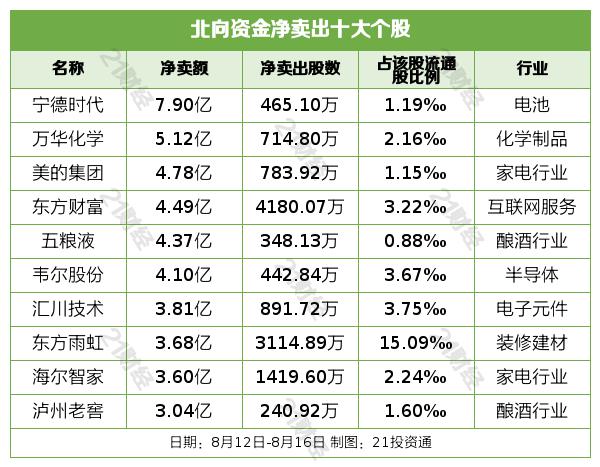 北向资金净卖出宁德时代 ( 300750.SZ ) 、万华化学 ( 600309.SH ) 、美的公司 ( 000333.SZ ) 、东方财富 ( 300059.SZ ) 、五粮液 ( 000858.SZ ) 其中,宁德时代被净卖出。 7.90 万华化学被净卖出亿元。 5.12 亿元,美丽的公司被卖掉了 4.78 东方财富被净卖出亿元。 4.49 亿元,五粮液净卖出。 4.37 亿元。