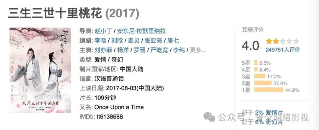随后是杨洋刘亦菲的大电影《三生三世十里桃花》,顶级生花,新剧IP,配备一流,光源最低8亿。但随后,粉丝“锁场”带来的娄子和杨洋的“拉面舞”硬控了原本应该传播口碑的营销。最重要的是,这部电影最终只获得了4亿的票房,这是一个损失。